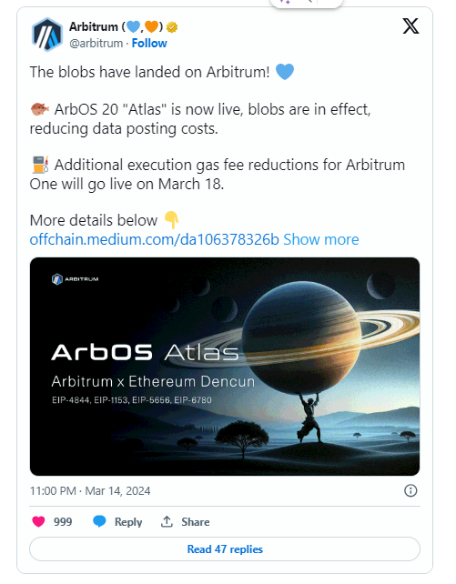 Các khoản phí trên mạng lưới Arbitrum đã được cập nhật vào ngày 13 tháng 3, sau khi kích hoạt Dencun trên Ethereum mainnet. Một phần quan trọng của nâng cấp này là EIP-4844, được thiết kế để mở rộng mạng lưới bằng cách tạo ra một loại giao dịch mới cho một đối tượng lớn nhị phân. Bản cập nhật này dự kiến giảm chi phí của các hoạt động lớp 2 lên đến mười lần và tăng đáng kể khả năng xử lý của Ethereum.
