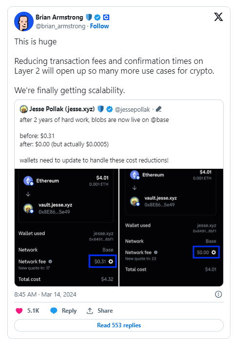 Các mạng lớp 2 khác như OptimismBase cũng đã cải thiện đáng kể hiệu suất gas của họ sau khi triển khai bản cập nhật Dencun. Phí gas trong giao thức Base đã giảm ngay lập tức từ 0.31 đô la xuống chỉ còn 0.0005 đô la.