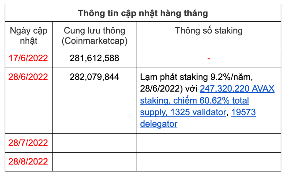 | 28/6/2022 | 282,079,844 | Lạm phát staking 9.2%/năm, 28/6/2022) với 247,320,220 AVAX staking, chiếm 60.62% total supply, 1325 validator, 19,573 delegator |