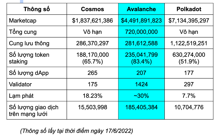 | Thông số | Cosmos | Avalanche | Polkadot |