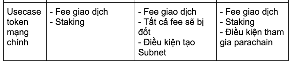 | Usecase token mạng chính | – Fee giao dịch – Staking | – Fee giao dịch – Tất cả fee sẽ bị đốt- Điều kiện tạo Subnet | – Fee giao dịch – Staking – Điều kiện tham gia parachain |