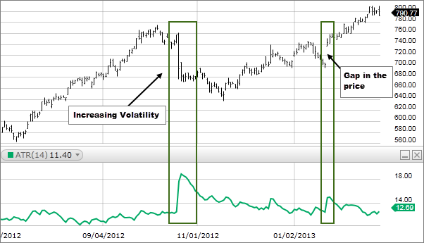 • ATR mở rộng cho thấy sự tăng động của thị trường, với phạm vi của mỗi thanh tăng lên. Sự đảo chiều giá với sự tăng của ATR sẽ cho thấy sức mạnh đằng sau động thái đó. ATR không có hướng đi nên ATR mở rộng có thể cho thấy áp lực bán hoặc áp lực mua. Giá trị ATR cao thường xuất hiện sau một đợt tăng giảm mạnh và khó có thể duy trì trong thời gian dài.