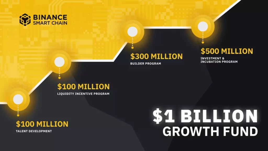 Sàn giao dịch tiền điện tử lớn nhất thế giới Binance gây quỹ tăng trưởng trị giá 1 tỷ đô la để hỗ trợ chuỗi khối Binance Smart Chain, với mục tiêu giúp đẩy nhanh việc áp dụng tài sản kỹ thuật số và công nghệ blockchain.