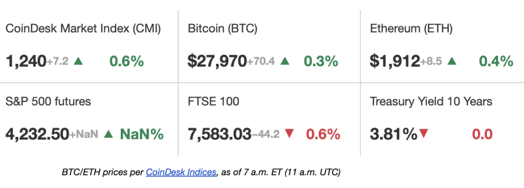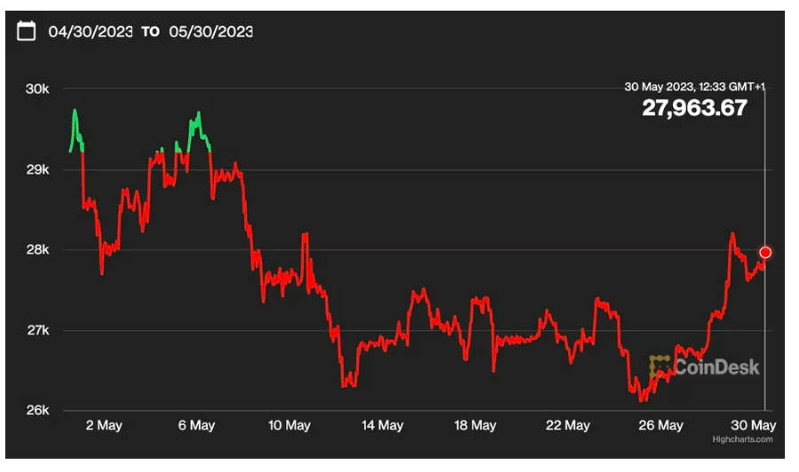 Tại thời điểm này, giá của Bitcoin đang dưới $28,000, và trong tháng 5, giá đã giảm khoảng 5%. Điều này đại diện cho mức giảm hàng tháng đầu tiên trong năm, giả sử tình hình vẫn ổn định cho đến thứ Tư. Trong khi đó, Ether (ETH) đã có sự tăng nhẹ trong tháng 5 sau một thời gian giao dịch trong biên độ hẹp trong hầu hết tháng.