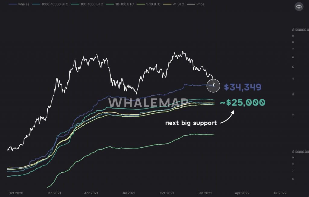 Theo biểu đồ được đăng bởi Whalemap, nếu 34,000 đô la không giữ được, mức hỗ trợ chính tiếp theo ở gần 25.000 đô la.