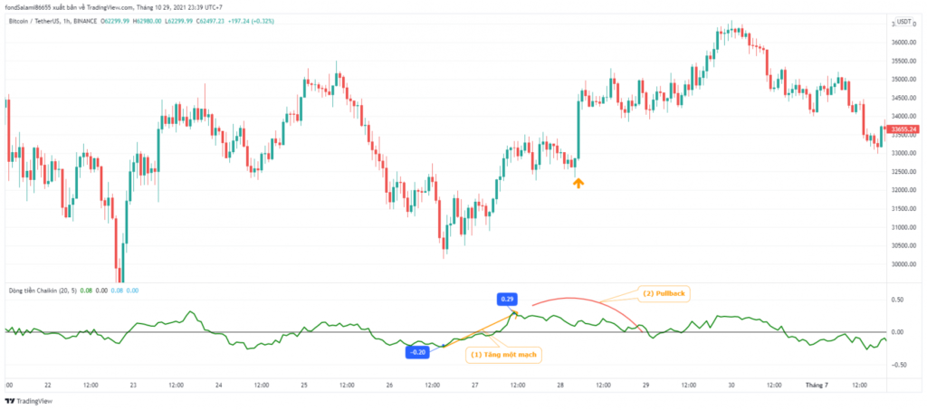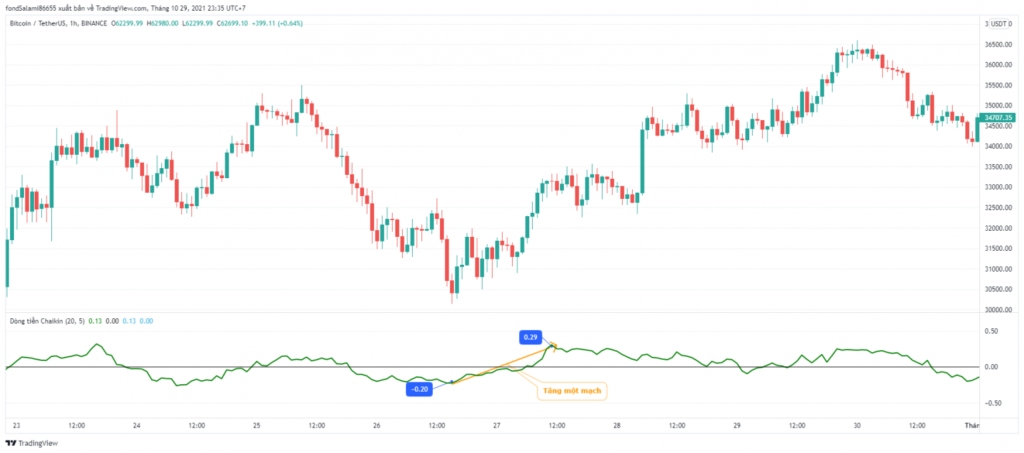 Khi giá tăng trong khi khối lượng giao dịch tăng lên, chỉ báo CMF sẽ tăng lên, cho thấy sức mạnh của xu hướng tăng. Ngược lại, khi giá giảm trong khi khối lượng giao dịch tăng lên, chỉ báo CMF sẽ giảm, cho thấy sức mạnh của xu hướng giảm.