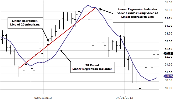 Chỉ báo Linear Regression (Hồi quy tuyến tính) trình bày giá trị kết thúc của đường hồi quy tuyến tính trong một số thanh xác định; cho thấy về mặt thống kê, giá được dự kiến sẽ ở đâu. Ví dụ, Chỉ báo Linear Regression với chu kỳ 20 sẽ bằng giá trị kết thúc của đường hồi quy tuyến tính trên 20 thanh.
