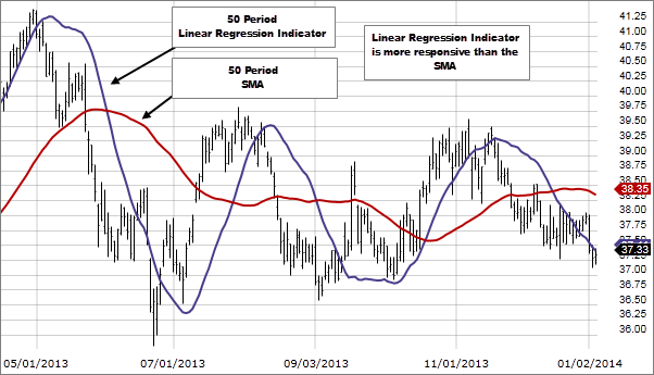 Cách diễn giải của Chỉ báo Linear Regression tương tự như đường trung bình động (moving average) nhưng nó có một lợi thế so với đường trung bình động. Thay vì vẽ đường trung bình của hành động giá trong quá khứ, nó vẽ đường hồi quy tuyến tính nơi mà mong đợi giá sẽ đến, làm cho Chỉ báo Linear Regression đáp ứng nhanh hơn so với đường trung bình động.