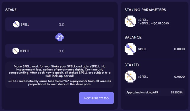 Hơn nữa, SPELL có thể được stake trong Wizard Dashboard để nhận token sSPELL, mà được sử dụng để chia sẻ phí trong nhóm staking pool và quản trị SPELL của Abracadabra DAO. Tất cả các khoản phí mà giao thức tạo ra từ lãi suất, phí vay và phí thanh lý được phân phối trong nhóm staking pool SPELL dưới dạng token SPELL và hiện đang mang lại mức lợi tức khoảng 25%.