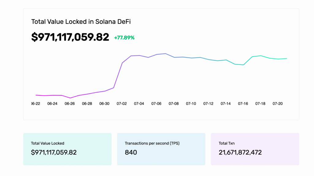 Hiện tại, tổng giá trị bị khóa trong DeFi của Solana là khoảng 962 triệu đô la , với khoảng 75% TLV trong ba dApp: Raydium, Serum Dex và Serum Swap. Mặc dù TVL của Solana còn thấp hơn nhiều so với Ethereum và Binance Smart Chain, nhưng đó vẫn là một thành tích đáng kể dự án vẫn còn ở giai đoạn đầu phát triển.