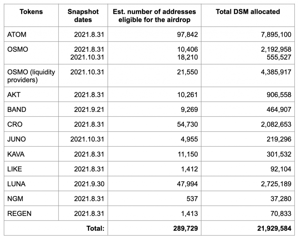 Để giúp cho Desmos hướng tới cộng đồng nhiều hơn, dự án thông báo chương trình airdrop DSM cho cộng đồng Interchain community! 21 triệu DSM (21% nguồn cung cung) sẽ được phân bổ airdrop cho các staker trên các mạng blockchain khác nhau.