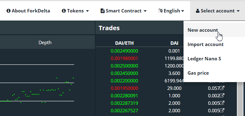 Hãy bắt đầu với việc thiết lập. Sau khi truy cập trang ForkDelta, bạn có thể chọn tạo tài khoản mới, nhập tài khoản, kết nối ví MetaMask của mình hoặc kết nối ví phần cứng Ledger Nano S của bạn. Bạn có thể tìm thấy các tùy chọn này ở góc trên cùng bên phải của trang.