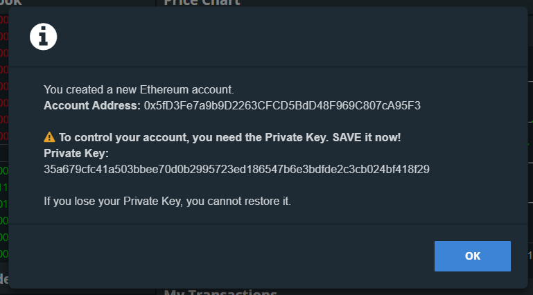 Nếu bạn quyết định tạo một tài khoản mới, ví Ethereum mới sẽ tự động được tạo cho bạn. Sau đó, trang web sẽ cung cấp cho bạn địa chỉ ví cũng như khóa cá nhân của bạn, về cơ bản đây là ‘mật khẩu’ cho ví của bạn. Bạn phải luôn giữ điều này an toàn nhất có thể vì nếu ai đó biết địa chỉ ví của bạn và khóa riêng tư của ví thì người đó có thể truy cập vào tất cả số tiền trong ví.