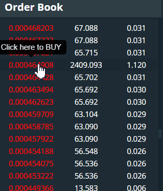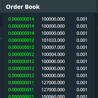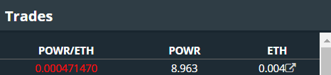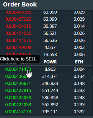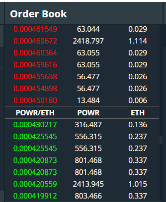Cột đầu tiên hiển thị giá mỗi ETH cho mã token POWR. Màu đỏ biểu thị lệnh bán và màu xanh lá cây biểu thị lệnh mua. Cột thứ hai hiển thị số lượng POWR có sẵn để bán/mua và cột thứ ba hiển thị số tiền tương đương bằng ETH. Sổ lệnh được sắp xếp từ giá cao nhất đến giá thấp nhất.