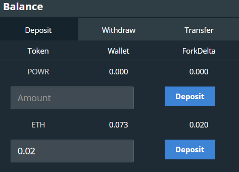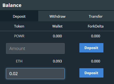 Không giống như AirSwap, cho phép bạn sử dụng ví MetaMask của mình để giao dịch trực tiếp mã token ERC20. ForkDelta áp đặt trên lớp bổ sung, tài trợ cho hợp đồng thông minh cơ bản. Để làm điều này, bạn sẽ phải sử dụng ô ‘Balance’ ở phía trên bên trái màn hình. Ở đây, tôi đang gửi 0,02ETH từ ví MetaMask của mình vào hợp đồng thông minh ForkDelta. Nếu tôi có các mã token ERC20 khác trong ví của mình, tôi cũng có thể chọn gửi chúng.