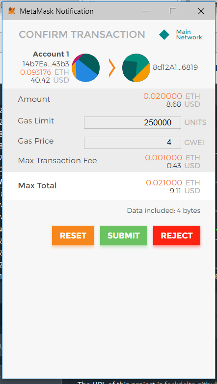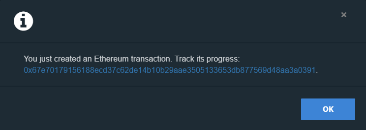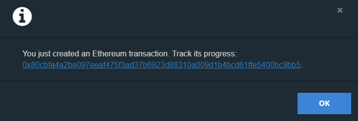 Lưu ý rằng gas price thực sự được đặt hơi cao. Bạn có thể đến ETH Gas Station để kiểm tra giá gas tiêu chuẩn và giá gas thấp an toàn. Khi bạn nhấp vào gửi, thông báo sau sẽ bật lên. Thông báo này cũng cung cấp cho bạn ID băm giao dịch mà bạn có thể kiểm tra trên Etherscan.