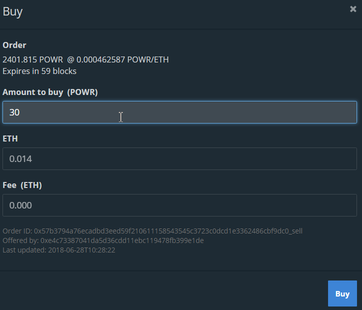 Khi bạn nhấp vào lệnh bán có liên quan, cửa sổ bật lên bên dưới sẽ xuất hiện. Và bạn có thể điều chỉnh lượng POWR muốn mua. Từ đó, MetaMask sẽ nhắc bạn xác nhận đơn đặt hàng. Tương tự như quá trình gửi mã token ở trên. Cuối cùng, ForkDelta sẽ cung cấp cho bạn ID băm của giao dịch và liên kết đến Etherscan.