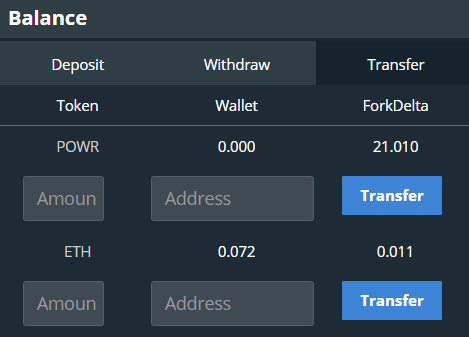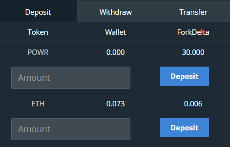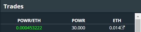 Bây giờ bạn có thể thấy rằng hộp ‘Balance’ của tôi hiển thị số dư mới của tôi. Và với ít ETH hơn và 30 mã tokwn POWR của tôi. Bạn cũng có thể xem giao dịch tôi vừa thực hiện trong ô ‘Trades’ ở góc bên phải màn hình.