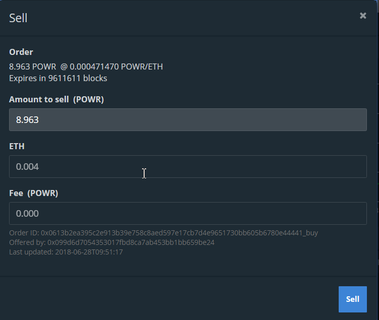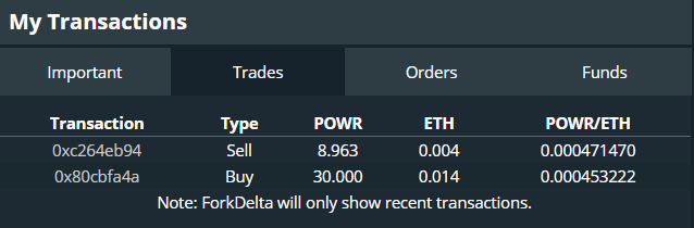 Bây giờ, hãy bán lại một số mã token POWR trên ForkDelta. Trong trường hợp này, tôi sẽ chọn lệnh mua có giá cao nhất. Thật trùng hợp, lần này tôi có thể hoàn thành toàn bộ đơn đặt hàng.