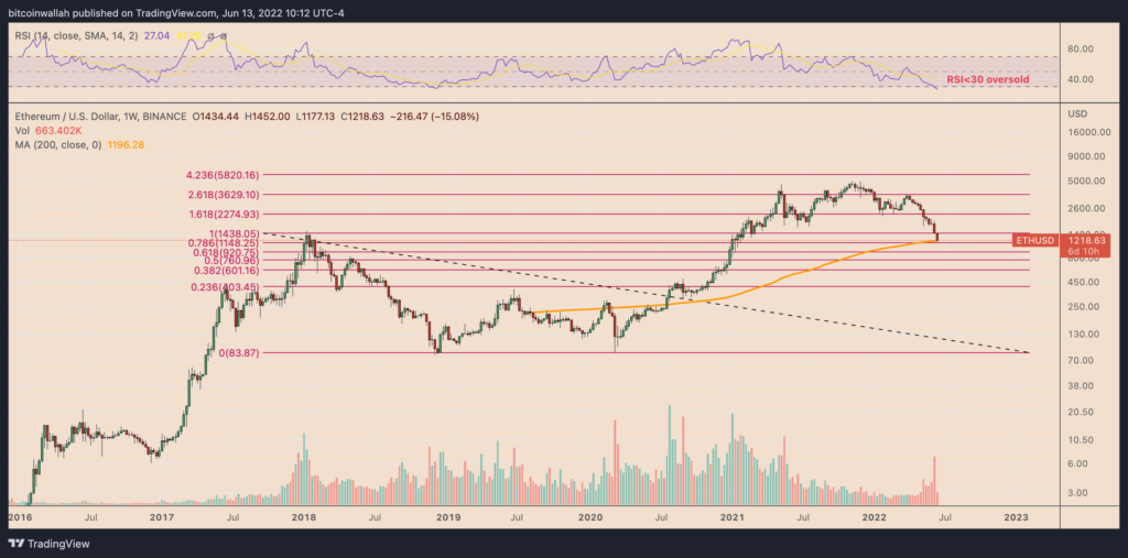 Tuy nhiên, chỉ số sức mạnh tương đối (RSI) quá bán của Ether có thể dẫn đến sự đảo chiều giá mạnh. Ethereum chọn các tín hiệu phục hồi bổ sung từ đường trung bình động đơn giản 200 tuần của nó (SMA 200 tuần; sóng màu cam trong biểu đồ bên dưới) gần 1.200 đô la, hiện đóng vai trò là hỗ trợ.