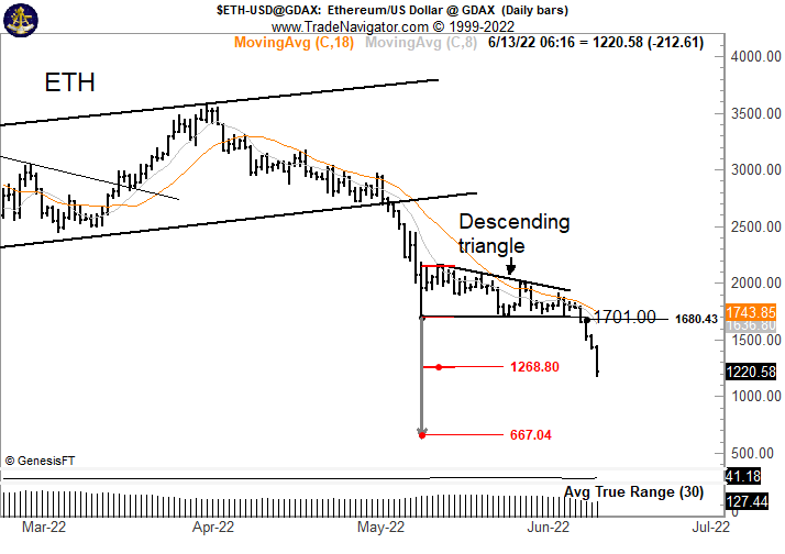 Brandt nói rằng ETH đã đạt mục tiêu giảm đầu tiên của tam giác là 1.268 đô la khi giá giảm 20% vào ngày 13 tháng 6. Anh ấy dự đoán sự sụt giảm sẽ tiếp tục, với ETH giảm gần 50% nữa xuống còn 667 đô la.