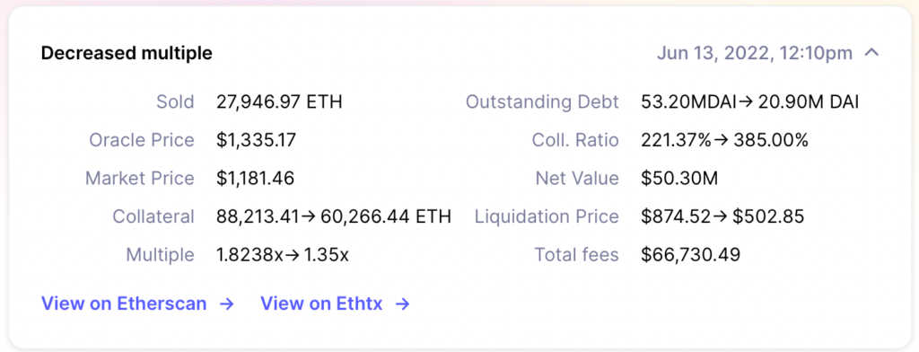 Một bằng chứng cho thấy cá voi này đã bán số ETH nắm giữ của mình để trả khoản nợ trị giá gần 73 triệu đô la tại Oasis.app, một nền tảng cho vay DeFi. Quãng thời gian bán tháo đã chứng kiến giá thanh lý của ETH giảm từ 1.200 đô la xuống còn 875 đô la.