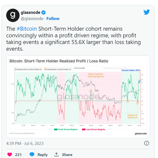 Theo chỉ số “tỷ lệ lợi nhuận/đánh mất thực tế” – realized profit/loss ratio từ việc kiểm tra lịch sử chuỗi giao dịch Bitcoin trong một khoảng thời gian cụ thể, những nhà nắm giữ Bitcoin ngắn hạn đang kiếm tiền thay vì thua lỗ. Trong tuần đầu tháng Bảy, số liệu hiện tại cho thấy STHs đang bán đồng tiền của họ với lợi nhuận.
