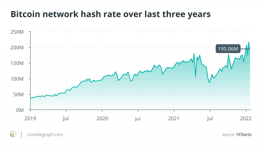 Tỷ lệ băm khai thác cho mạng Bitcoin đã phục hồi nhanh chóng từ mức giảm xuống còn 168 triệu TH / s, theo dữ liệu từ YCharts. Trên thực tế, mạng đã tiến một bước với tỷ lệ băm đạt mức cao nhất mọi thời đại mới là 215 triệu TH / s vào ngày 13 tháng 1.