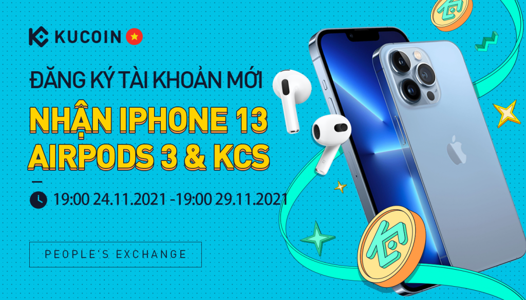 Đặc biệt, nhân dịp này, KuCoin Việt Nam tổ chức sự kiện “Đăng ký tài khoản mới – Nhận iPhone 13, Airpods 2 & KCS” cho người dùng mới tại Việt Nam từ 19:00 Ngày 24.11.2021 đến 19:00 ngày 29.11.2021
