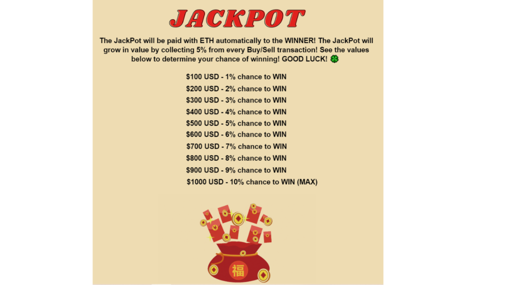 JackPot sẽ được thanh toán bằng ETH tự động cho người chiến thắng! Và JackPot sẽ tăng giá trị bằng cách thu thập 5% từ mỗi giao dịch Mua/Bán! Xem các giá trị dưới đây để xác định cơ hội của bạn để chiến thắng! CHÚC MAY MẮN! ????