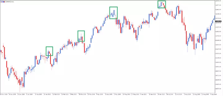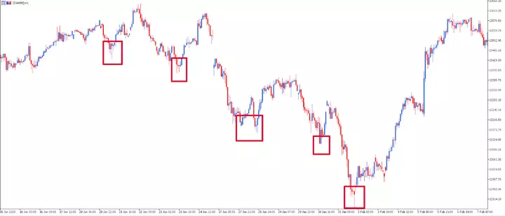 Sự đảo ngược của xu hướng chính đi xuống xảy ra khi thị trường không còn giảm xuống các mức thấp và mức cao thấp hơn nữa. Các đỉnh cao hơn và đáy cao hơn liên tiếp trong một thị trường có xu hướng đi xuống cho thấy khả năng đảo chiều sang xu hướng tăng.