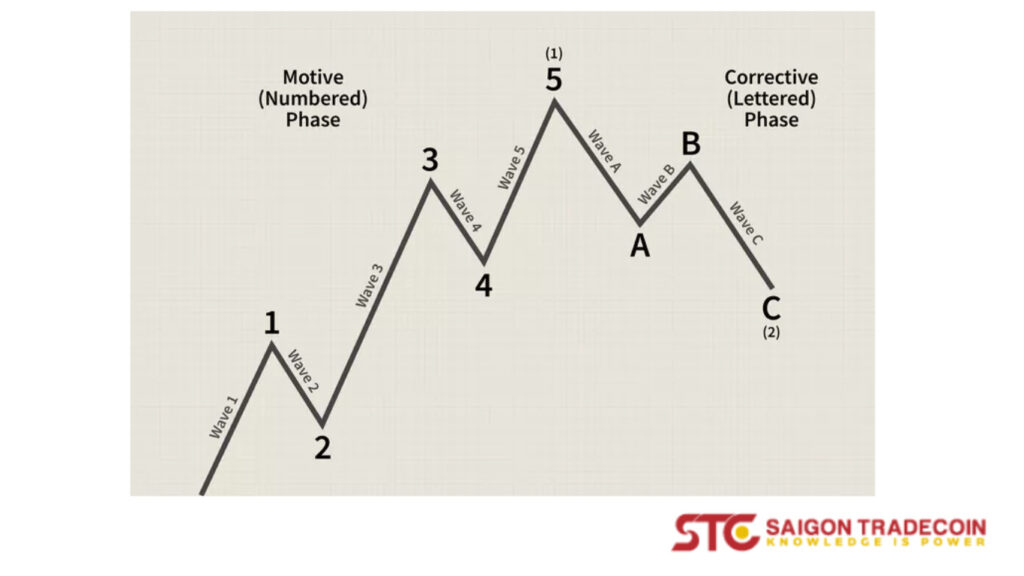 Một chu kỳ sóng Elliott hoàn chỉnh và cơ bản nhất khi thị trường tăng giá bao gồm 8 bước sóng và có cấu trúc 2 pha. Pha đầu tiên là sóng động lực (impulse wave) với 5 bước sóng được đánh dấu bằng số từ 1 đến 5, di chuyển theo xu hướng chính. Trong đó, sóng 1, 3 và 5 là các sóng tăng và sóng 2, 4 là những sóng giảm.