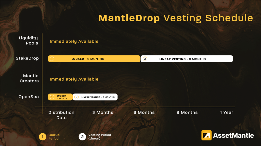 Lịch trình vesting cũng là một phần rất quan trọng của chương trình MantleDrop, được thiết kế đặc biệt để tạo điều kiện phát hành kịp thời các mã thông báo được airdrop theo cách hoạt động tốt nhất cho tất cả các bên. Lịch trình vesting cho MantleDrop như sau: