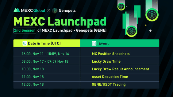 Trong phiên Launchpad này, MEXC đã nâng cấp quy tắc nhằm thu hút sự tham gia của người dùng. Trong thời gian chụp nhanh vị trí từ 23:00 ngày 12 tháng 11 đến 22:59 ngày 16 tháng 11(giờ VN), người dùng chỉ cần nắm giữ trung bình MX tối thiểu hơn 100 token để tham gia quay vé Launchpad. Người dùng chiến thắng có thể nhận được GENE với mức giá 0,8 USDT / vé.