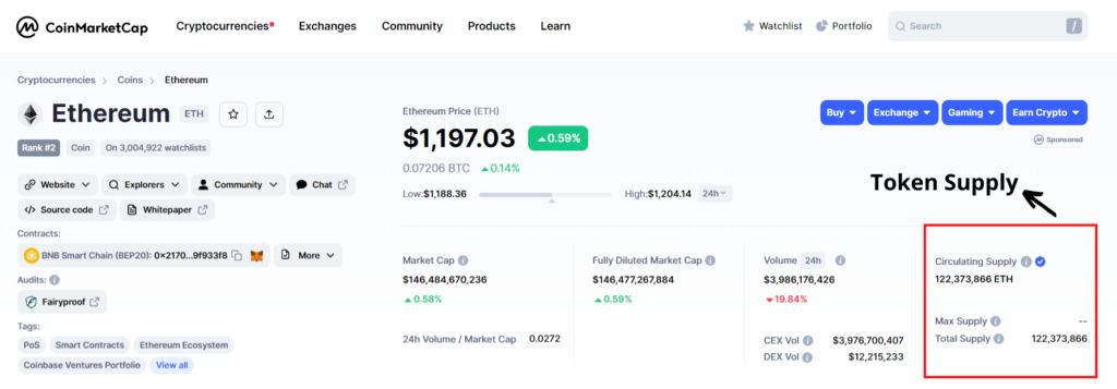 Token Supply là lượng cung của token. Nếu theo dõi thông tin về tiền điện tử trên CoinMarketCap bạn sẽ thường gặp 3 khái niệm: Total Supply, Circulating Supply và Max Supply