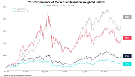 Cuối cùng, các altcoin có vốn hóa trung bình xuất hiện với tư cách là người chiến thắng vào năm 2021, đánh dấu mức lợi nhuận 830%. Chỉ số này chủ yếu bao gồm các token của các blockchain Lớp 1 đã chứng kiến một số mức tăng nhiều nhất trong năm, vượt trội hơn cả ethereum mặc dù nó đã có lợi nhuận khổng lồ 485% trong năm nay.