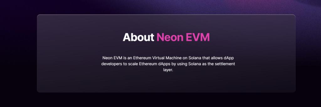 - Neon EVM là một Ethereum Virtual Machine trên nền tảng Solana, cho phép nhà phát triển dApp mở rộng các ứng dụng Ethereum bằng cách sử dụng Solana làm lớp thanh toán.