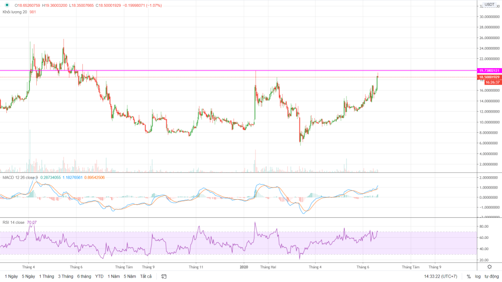 Mức kháng cự 19.80$ là một mức tương đối quan trọng cho giá REP vì nó là đỉnh cũ được thiết lập ngày 16 tháng 1 năm 2020 và cũng là mức fibo mở rộng 1.618%’. Vượt mức này REP sẽ đạt vùng 24$