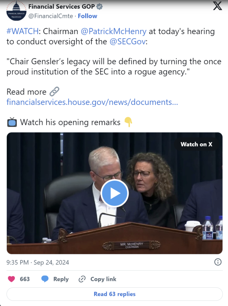 Trong phiên điều trần, các nhà lập pháp đã chỉ trích Gensler và SEC về chiến lược thực thi mạnh mẽ đối với tài sản kỹ thuật số. Trong nhiều năm, các nhà ủng hộ ngành và một số chính trị gia đã cho rằng Gensler và SEC đang tạo ra gánh nặng cho ngành công nghiệp mới nổi này bằng sự không chắc chắn về chính sách.