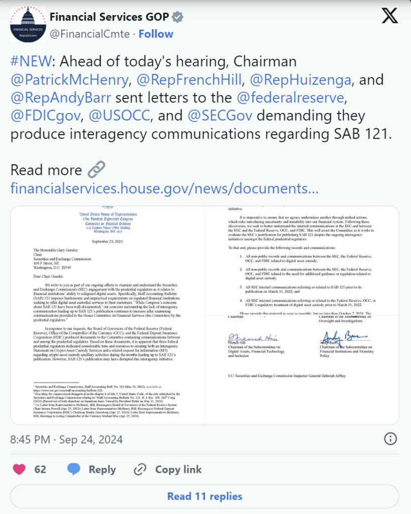 Trước cuộc họp FSC vào ngày 24 tháng 9, các nhà lập pháp Đảng Cộng hòa do Chủ tịch Ủy ban Patrick McHenry dẫn đầu đã yêu cầu SEC, Cục Dự trữ Liên bang, Cơ quan Bảo hiểm Tiền gửi Liên bang, và Văn phòng Kiểm soát Tiền tệ thu hồi Thông báo Kế toán Nhân viên 121.