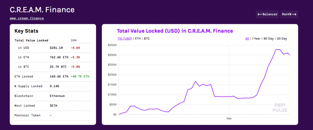 CREAM Finance Network đã chứng kiến sự phát triển lớn vào tháng 9 cho đến nay. Kể từ ngày 1 tháng 9, tổng giá trị bị khóa trong CREAM Finance đã tăng gấp ba lần, từ 89 triệu đô la lên 300 triệu đô la vào thời điểm truyền thông, theo Defi Pulse .