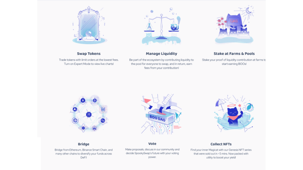 SpookySwap cung cấp nhiều tính năng hấp dẫn cho người dùng, bao gồm farming, staking và yield farming. Người dùng có thể cung cấp thanh khoản vào các cặp giao dịch trên SpookySwap để kiếm lợi nhuận và phần thưởng BOO – đồng token của sàn giao dịch. Ngoài ra, SpookySwap cũng cho phép người dùng cung cấp BOO để stake và đóng góp vào việc cung cấp thanh khoản trên sàn giao dịch, nhận lại phần thưởng và tiền lãi từ việc stake BOO.