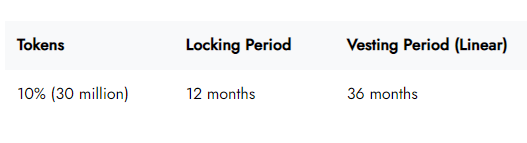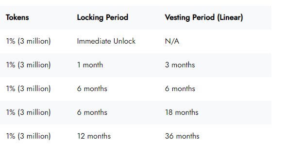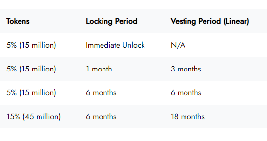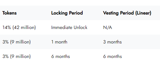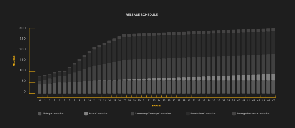 Tổng nguồn cung tại Genesis sẽ là 300 triệu token và nó sẽ tuân theo lịch trình lạm phát giảm một nửa trong hai năm theo phân phối như chi tiết bên dưới: