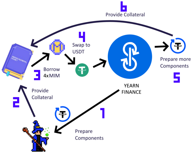 Giao diện của nền tảng cung cấp việc sử dụng MIM đã vay để cung cấp nhiều tài sản thế chấp hơn, tương đương với đòn bẩy. Tuy nhiên, một chiến lược tương tự có thể được triển khai tự động với DAI của MakerDAO thông qua InstaDApp.