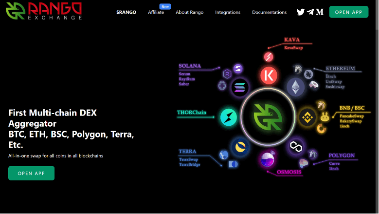 Rango Exchange là một công cụ tổng hợp Multi-chain DEX Aggregator. Nó kết hợp sức mạnh của các trình tổng hợp DEX bên trong các chuỗi khối (ví dụ 1Inch) với nhiều cầu nối (ví dụ Binance Bridge) và các nhà cung cấp thanh khoản chuỗi chéo (ví dụ: Thorchain) để cung cấp cho bạn quyền truy cập vào tính thanh khoản tốt hơn.