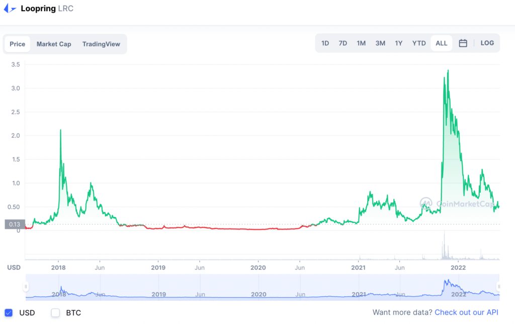 Trong phần lớn năm 2018, 2019 và 2020, Loopring giao dịch ổn định và không có nhiều sự tăng trưởng về giá. Tuy nhiên vào cuối năm 2021, Loopring đã tăng vọt hơn 700% về giá và đặt mức cao ATH 3.83 đô la. Sự tăng giá mạnh phần lớn được thúc đẩy bởi sự hợp tác của Loopring với GameStop (GME). Loopring hợp tác với GameStop để xây dựng sàn giao dịch NFT phi tập trung. Mối quan hệ hợp tác này đã mang lại cho Loopring một lượng lớn cơ hội tiếp xúc và cho phép Loopring nhận được sự hỗ trợ tài chính và hiệu ứng của đội ngũ các nhà đầu tư lớn của GameStop. Ngoài quan hệ đối tác GameStop, sự gia tăng vượt bậc của Loopring cũng có thể là do sự cường điệu ngày càng tăng xung quanh các giải pháp lớp 2.