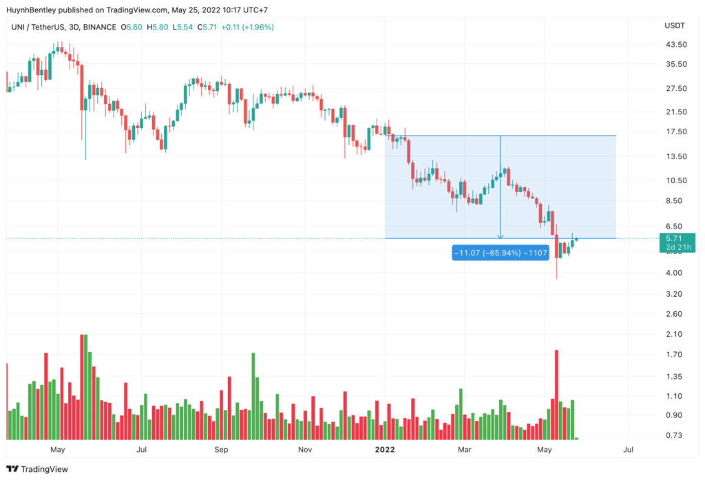 So với mức đỉnh ATH là 45 đô la vào tháng 05/2021, giá UNI tròn 1 năm sau đã chia đến 9 lần, đã có lúc giảm về tận 3.73 đô la vào ngày 12/05/2022.