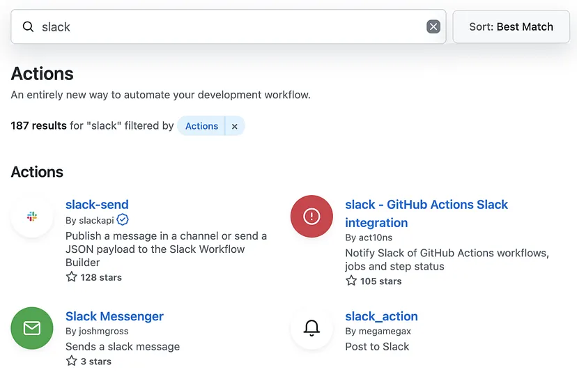 Hãy cùng xem ví dụ sử dụng slack-send action do chính Slack phát triển. Có một số tùy chọn để gửi thông báo bằng hành động này: quy trình làm việc Slack, ứng dụng Slack và webhook sắp tới. Hai cái cuối cùng đang gửi tải trọng thô dưới dạng tin nhắn, vì vậy bạn có thể thêm một số tính tương tác và biểu cảm thông qua Block Kit vào tin nhắn hoặc chỉ gửi một vài dòng văn bản thuần túy.