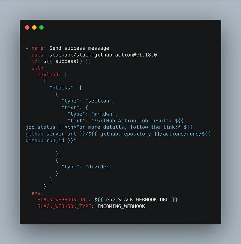 Ví dụ bên dưới minh họa thông báo được gửi khi một công việc thành công (xem câu lệnh “if”), với trạng thái của công việc và liên kết đến một lần chạy cụ thể để biết thêm chi tiết.