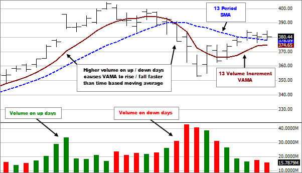 Đường trung bình động (Moving average) dựa trên thời gian đưa ra giả định rằng tất cả các ngày giao dịch đều bằng nhau. Những ngày giao dịch quan trọng thường đi kèm với khối lượng lớn hơn. VAMA làm cho các đối tác giá và khối lượng bằng nhau khi tính giá trị trung bình. Những ngày giao dịch có khối lượng cao hơn được đánh giá cao hơn những ngày có khối lượng giao dịch thấp hơn.